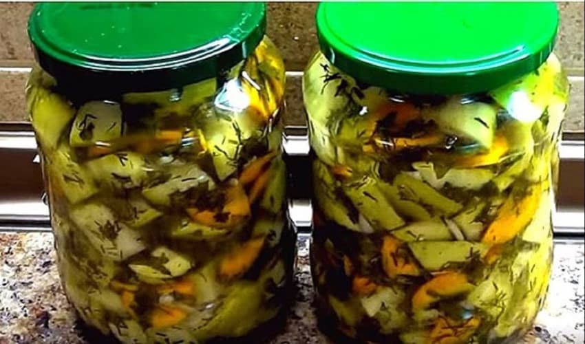 Как видите, кабачки являются универсальным овощем. Из них можно приготовить закуску, которая может заменять и грибы и ананасы. Теперь рассмотрим рецепт, благодаря которому, кабачки будут напоминать вкус соленых огурцов.