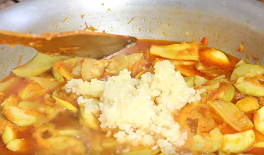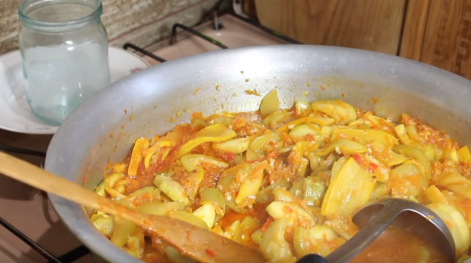 - В большом сотейнике разогрейте растительное масло, выложите в него маринованные овощи и прокипятите (без крышки) не менее 20 минут.