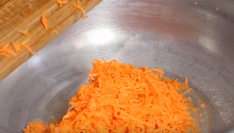 - В это время подготовьте морковь. Ее необходимо промыть, соскрести кожицу и натереть на терке с крупными отверстиями.