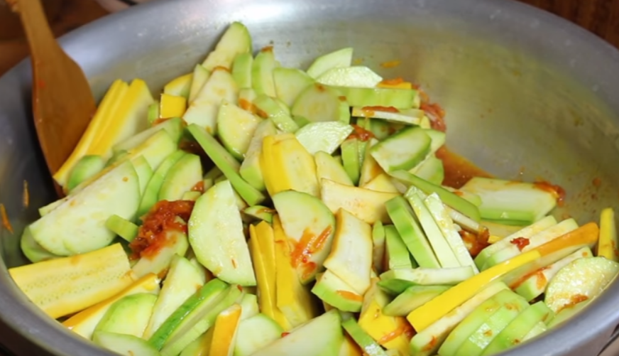 - Доложите в тушеную смесь кабачки и перемешайте. Так как у него довольно нежная мякоть, жарить на этой стадии достаточно минут 8.