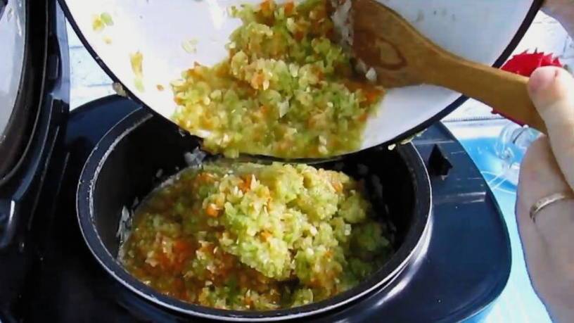 4. Теперь настала очередь главного продукта. В ту же не мытую чашу вливаем остатки масла на котором и будем жарить кабачки. Это займёт приблизительно 20 минут в течении которых необходимо постоянно перемешивать массу