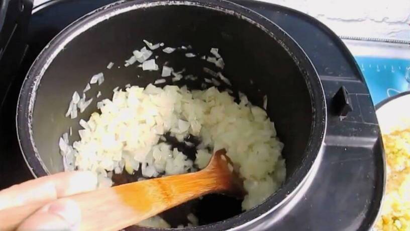Шаг 7. В чашу мультиварки налейте подсолнечное масло. Выложите измельченный лук. На панели прибора установите программу «Жарка», время – 5 минут. Периодически помешивая лопаткой, слегка зарумяньте.