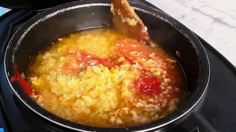 - Ввести томат. Потомить под крышкой до готовности примерно полтора часа. Воду не добавлять, жидкости будет достаточно.
