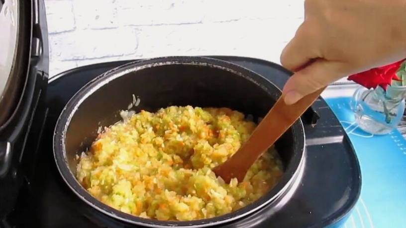 Шаг 8. Затем переложите измельченные кабачки с морковкой. Установите программу «Тушение», время – 45 минут. Крышку прибора закройте.