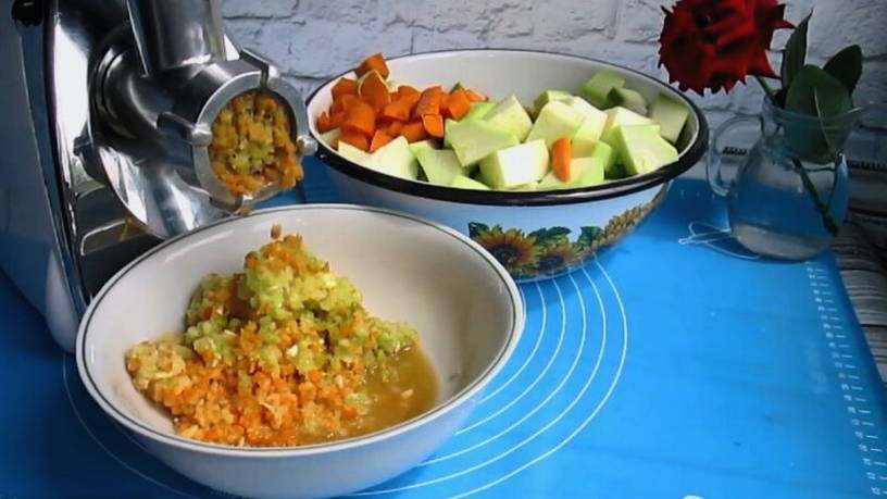 Шаг 5. Морковь вымойте от песка и прочих загрязнений. С помощью овощечистки удалите кожуру. Очищенную морковь нарежьте. Кабачки и морковку перекрутите, воспользовавшись мясорубкой. У меня электрическая мясорубка. Поэтому процесс занимает минимум времени.