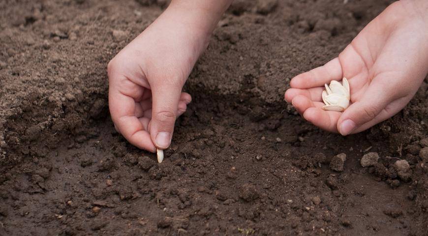 После, в подготовленные лунки, на дно которых укладывается компост или органический мусор, высаживают 2-3 семечки, легко присыпая сверху и обильно проливая.