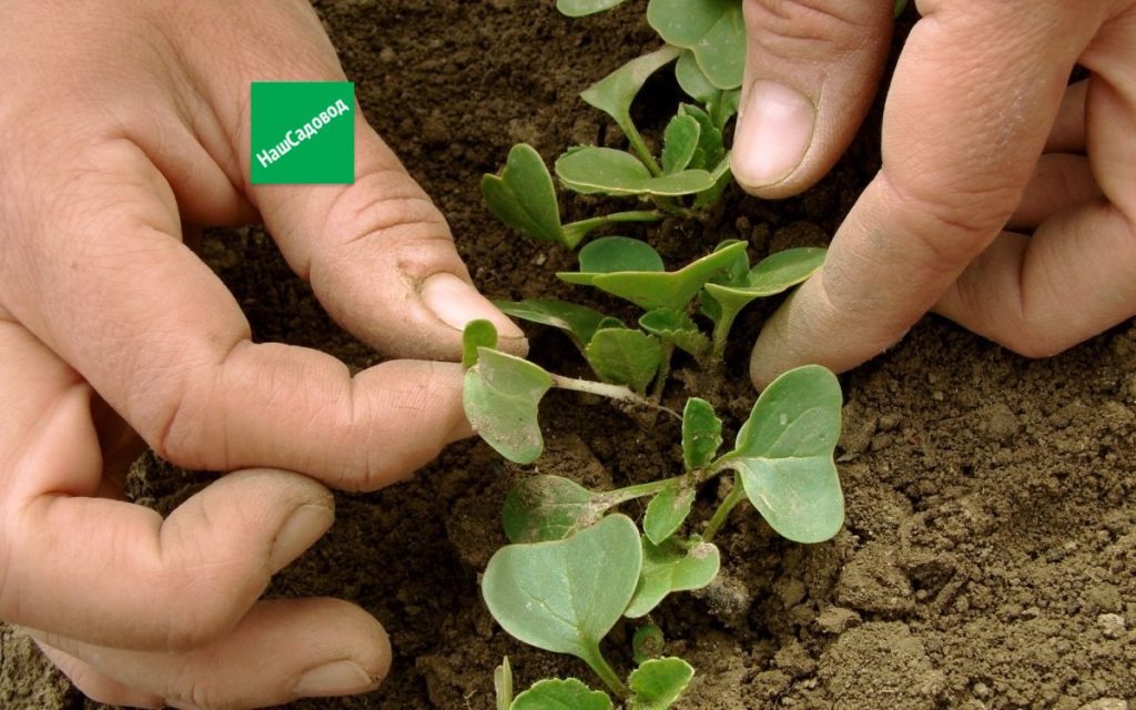 - Ещё через неделю выкопайте лунки, полейте, рассаду высадите на участок, присыпав грунтом до семядольных листьев.
