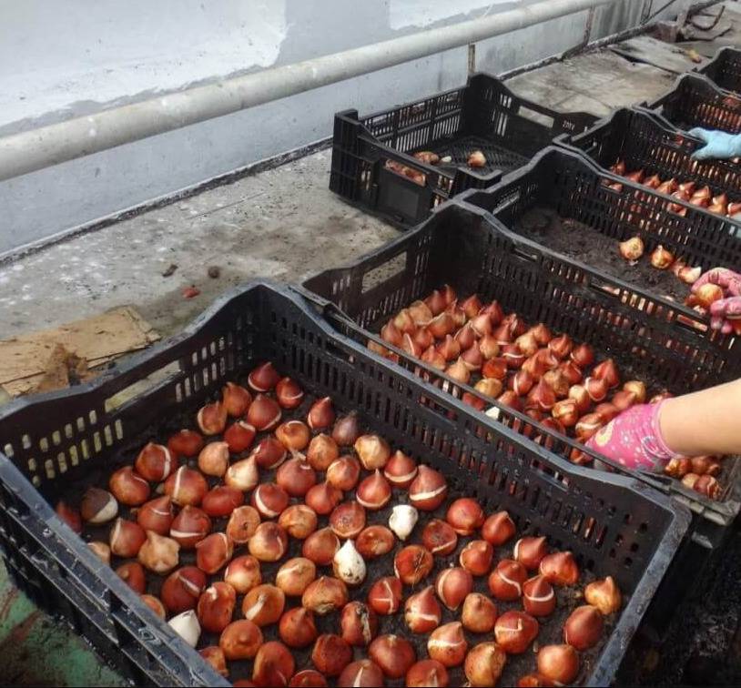 Полученный посадочный материал очищают от старых чешуек, удаляют корешки и снимают деток. Далее проводят сортировку по сортам и выкладывают в ящики. Накрывать нежелательно, иначе из-за образования конденсата может развиться плесень и гниль. До сентября тюльпаны держат в помещении при температуре от 15 до 20 градусов. Перед посадкой луковки закаляют, выносят ящики на свежий воздух.