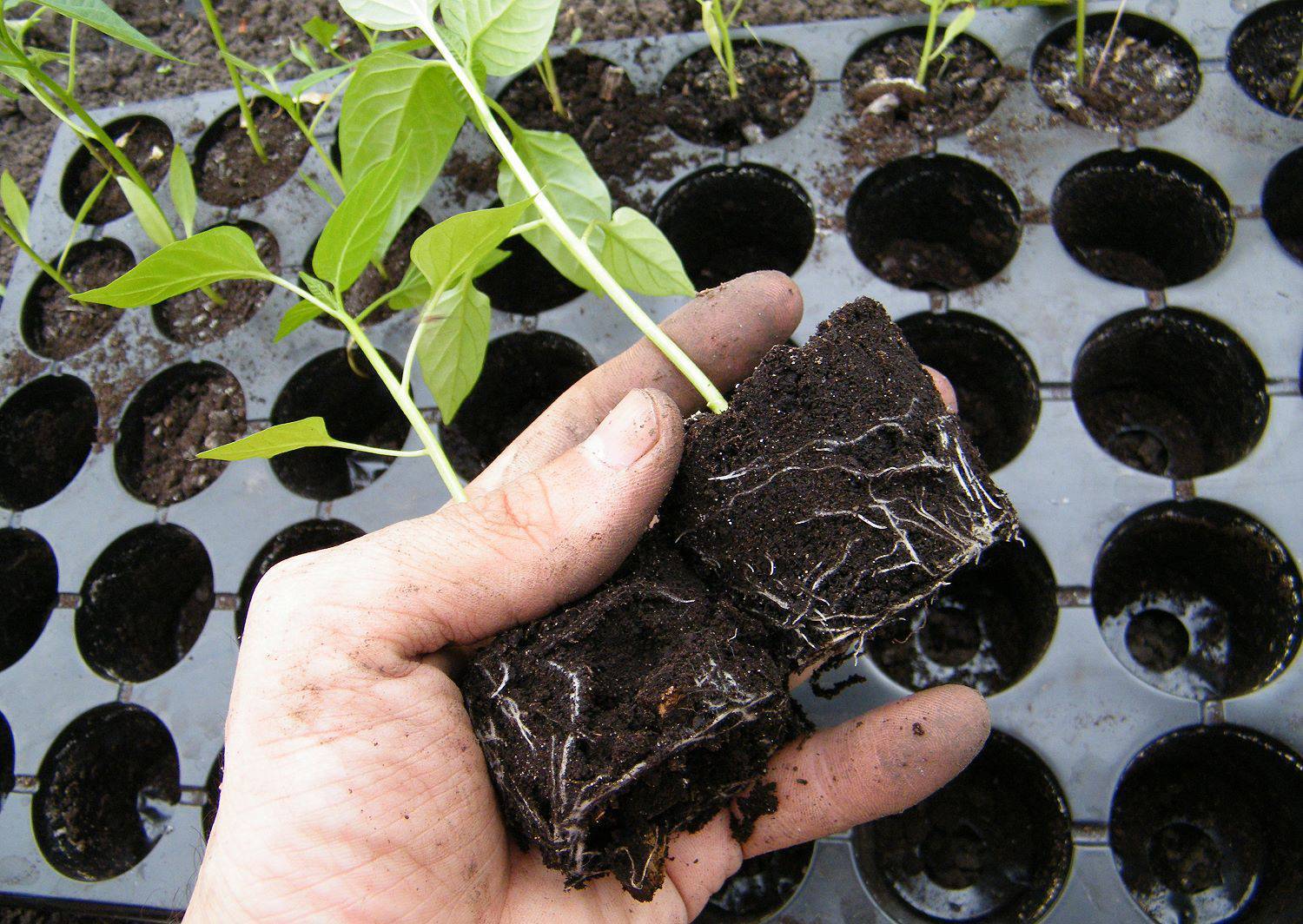 Пересадка болгарского перца в открытый грунт плохо переносится растением. Поэтому землю с корней лучше не убирать. Грунт нужно хорошо полить, подождать, пока полностью пропитается, придавить с боков стакан и достать корень вместе с комом земли.