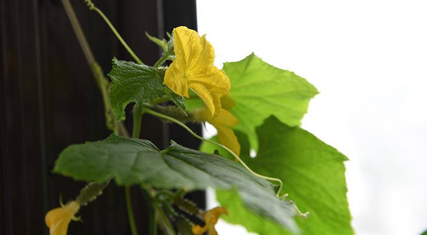 Цветение контейнерных огурцов в комнате около окна