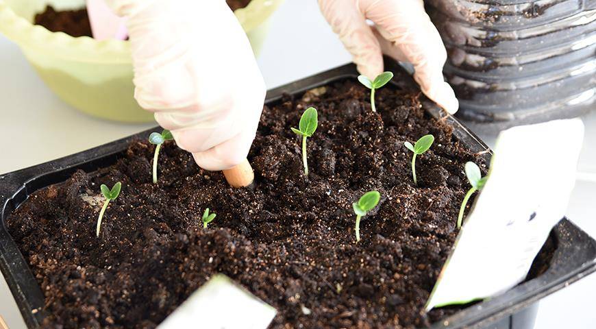 В центре рассадной емкости, отступая от стенок к 15 см, сделайте лунки на расстоянии 30 см друг от друга. Для подстраховки от возможного непрорастания сейте по два семечка в лунку. Глубоко заделывать семена не нужно, достаточно 1,5-2 см. Накройте посевы пленкой, пластиковым пакетом и держите контейнер на теплом светлом подоконнике при температуре +24…+26°С. Можно сеять в индивидуальные рассадные горшочки 6х6 см, проверьте, есть ли на дне отверстие для схода воды.