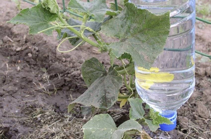 Этот способ особенно пригодится тем, кто бывает на даче наездами и не может каждый день поливать огурцы. Берут обычную пластиковую бутылку: если на 1,5-2 литра – этого хватит для двух растений; если бутылек на 3-5 литров – можно его приспособить сразу под 4 растения. Бутылку лучше брать темную – она аккумулирует дневное тепло, а ночью отдаст его корням.