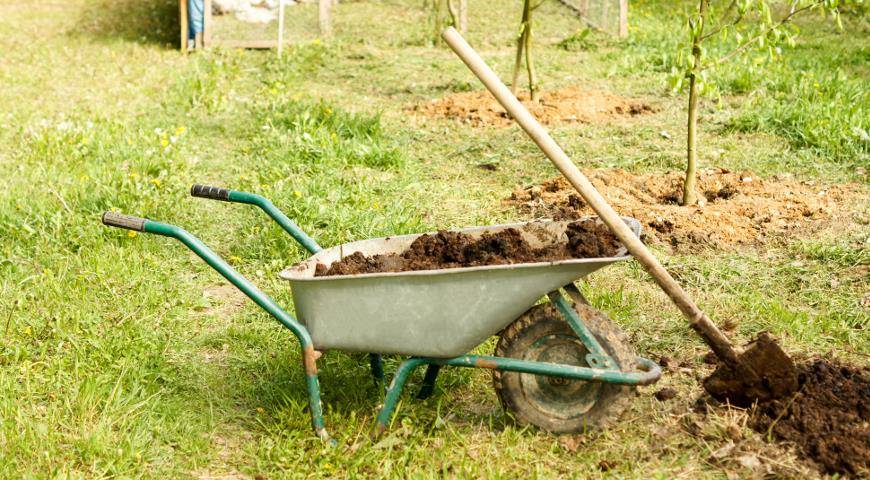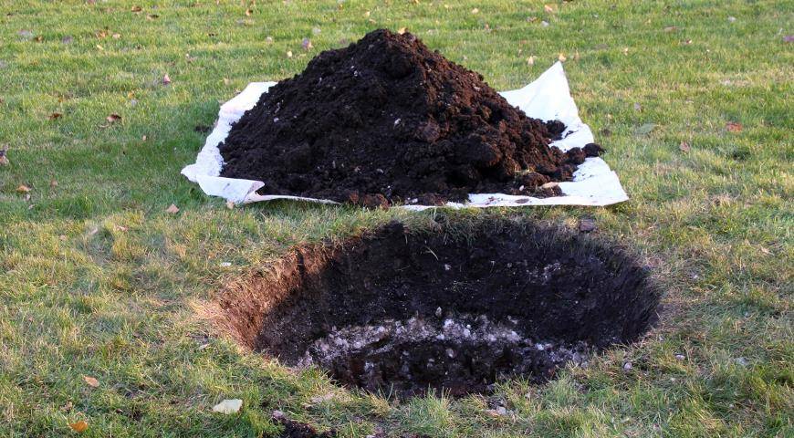 На глубину штыка лопаты снимают плодородный слой почвы и складывают на один кусок полиэтилена. Затем вынимают нижний слой до конечной глубины ямы, складывают на другой кусок. На легких и нормальных почвах он больше не понадобится, но пригодится для заполнения посадочной ямы на тяжелых почвах.
