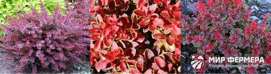 - Atropurpurea Nana — шаровидный кустарник размером до 60 см. Побеги тонкие, с мелкой округлой листвой. Летом листья барбариса насыщенно-пурпурные, осенью — огненно-красные. Цветет в конце мая — начале июня. Подходит для высаживания вдоль дорожек, в альпинариях и вазонах.