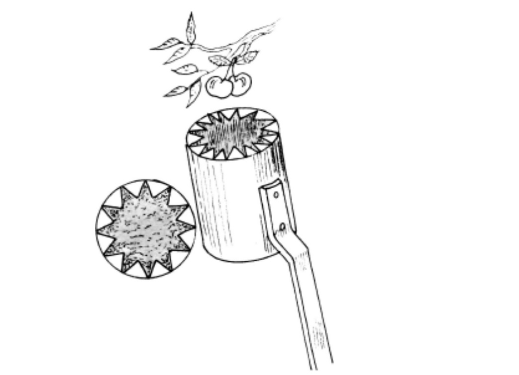 Гребенка изготовлена из отрезков стальной проволоки, согнутых под прямым углом. Они прочно соединены с емкостью для сбора плодов и длинным легким деревянным шестом.
