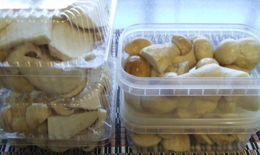 - Немного высушенные грибы раскладывают по емкостям для дальнейшей заморозки и помещают в морозильную камеру с оптимальной температурой от -5оС. В таких условиях гриб храниться максимально долго, полностью сохраняя свои полезные свойства.
