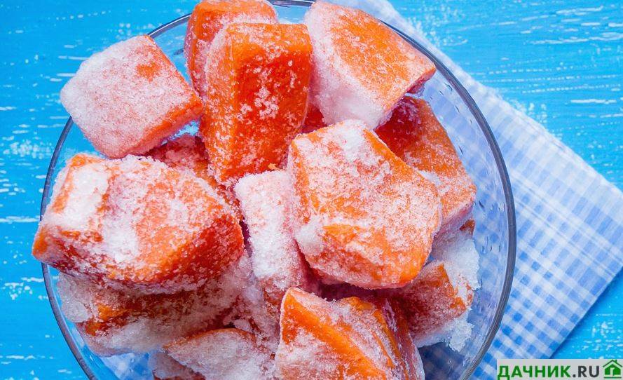Для этого необходимо подготовить тару, на дне которой будет насыпан сахарный песок небольшим слоем. Тыкву нужно хорошо помыть, избавить от кожуры, просушить и отправить на быструю заморозку. По истечению нескольких часов овощ можно собрать в емкости и отправить на хранение в морозилку.