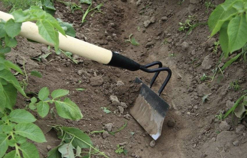 Лучше всего проводить рыхление после увлажнения грядок (если полив осуществлялся утром, рыхлить нужно вечером, а если земля увлажнялась вечером, то рыхлить следует рано утром). Вода должна полностью впитаться, а грунт – немного просохнуть. Рекомендуемая глубина рыхления колеблется в пределах 4-6 см. Огородники прибегают к данному приему, чтобы обезопасить картофельные кусты от фитофтороза, мокрой гнили, фузариоза.