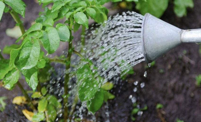 Для засухоустойчивого сорта это процедура не является обязательной. Однако в условиях хорошо увлажнённого грунта шансов получить крупные клубни гораздо больше. Поливают картофель в вечернее время отстоянной водой комнатной температуры трижды за вегетацию (при отсутствии естественных осадков):