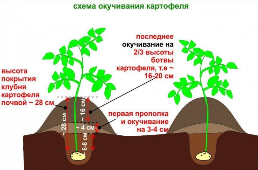 - Окучивание проводится 2 раза за сезон. В первый – когда ростки станут длиной 20 см в среднем, и второй – через 2-3 недели после проведения первой процедуры.