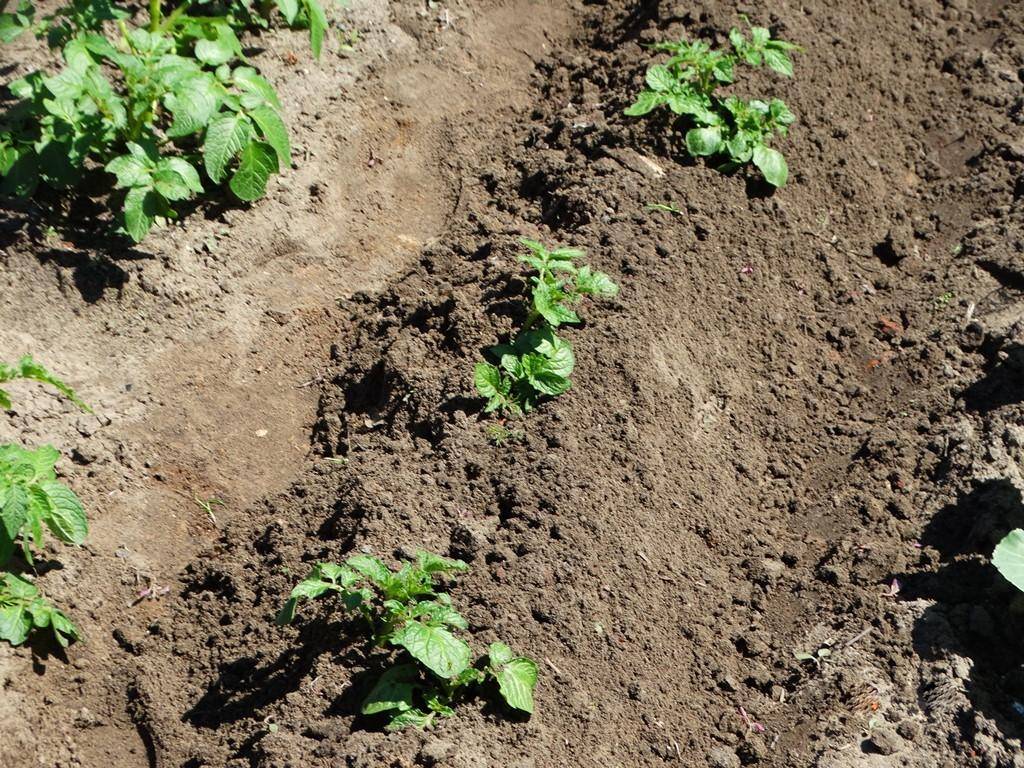 Подготовленную осенью почву перекапывают, разравнивают и выкапывают в ней лунки глубиной до 100 мм. Расстояние между каждой лункой должно составлять не менее 200 мм, а дистанция между рядами лунок устанавливается минимум в 600 мм. Проросшие картофелины укладываются в лунки, куда можно добавить по горсти древесной золы, а затем засыпаются грунтом. Посаженные картофелины не поливают во избежание образования поверхностных корней.