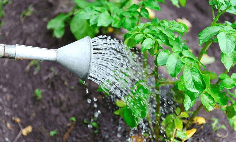 Если время от времени идут дожди, то поливать картофель ненужно. Однако во время длительной засухи растения поливают два-три раза за сезон. Первый полив нужен, когда только появились ростки, затем посадки поливают вовремя появления бутонов и последний раз после цветения.