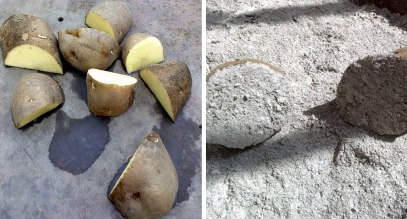 - обеззараживание можно выполнить народными средствами, например, протравливанием клубней марганцовкой или купанием в растворе золы (1 кг на ведро воды). Можно использовать и «Фитоспорин», комплексные препараты «Максим» или «Престиж» (для двух последних необходимо учитывать длительность периода распада).