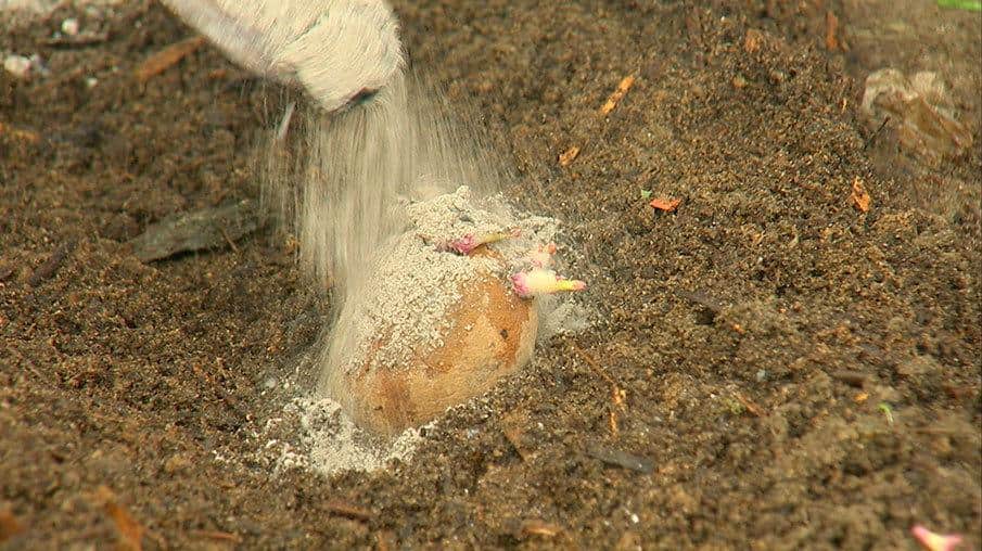 - В каждую лунку вносить удобрение из древесной золы и сухого перегноя в соотношении 1:7.