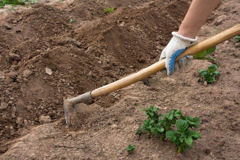 Работы по окучиванию грядок способствуют появлению у растений новых корневищ, что в результате приводит к увеличению урожайности. Для этого, под каждым кустом образуют насыпь из плодородного, рыхлого грунта до нижних листовых пластин.