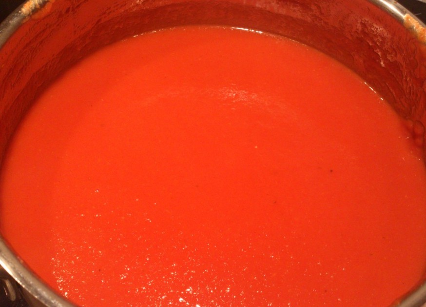 4. Ставим кастрюльку с будущим кетчупом на маленький огонь. Это занимает приблизительно минут 30-40. Не забываем регулярно перемешивать смесь.