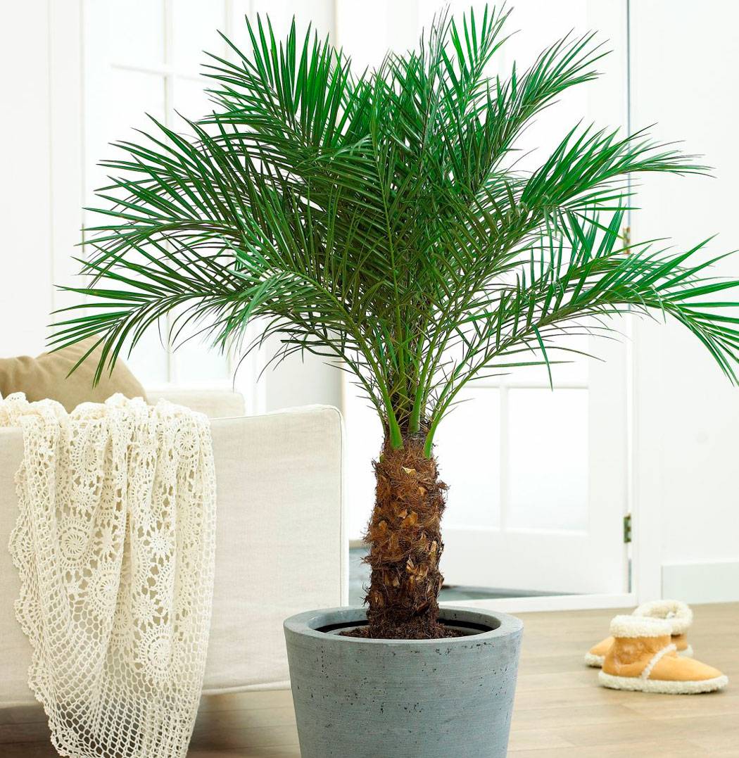 Робелена – самый миниатюрный вариант, идеален для комнаты. В высоту пальма достигает 2 метров. Может иметь один или несколько стволов. Густо расположенные на рахисе узкие, мягкие листочки темно-зеленого цвета в длину 12-20 см. Финик этого вида обязательно полюбит вашу комнату, если в ней будет тепло и сравнительно влажно (не менее 50%).