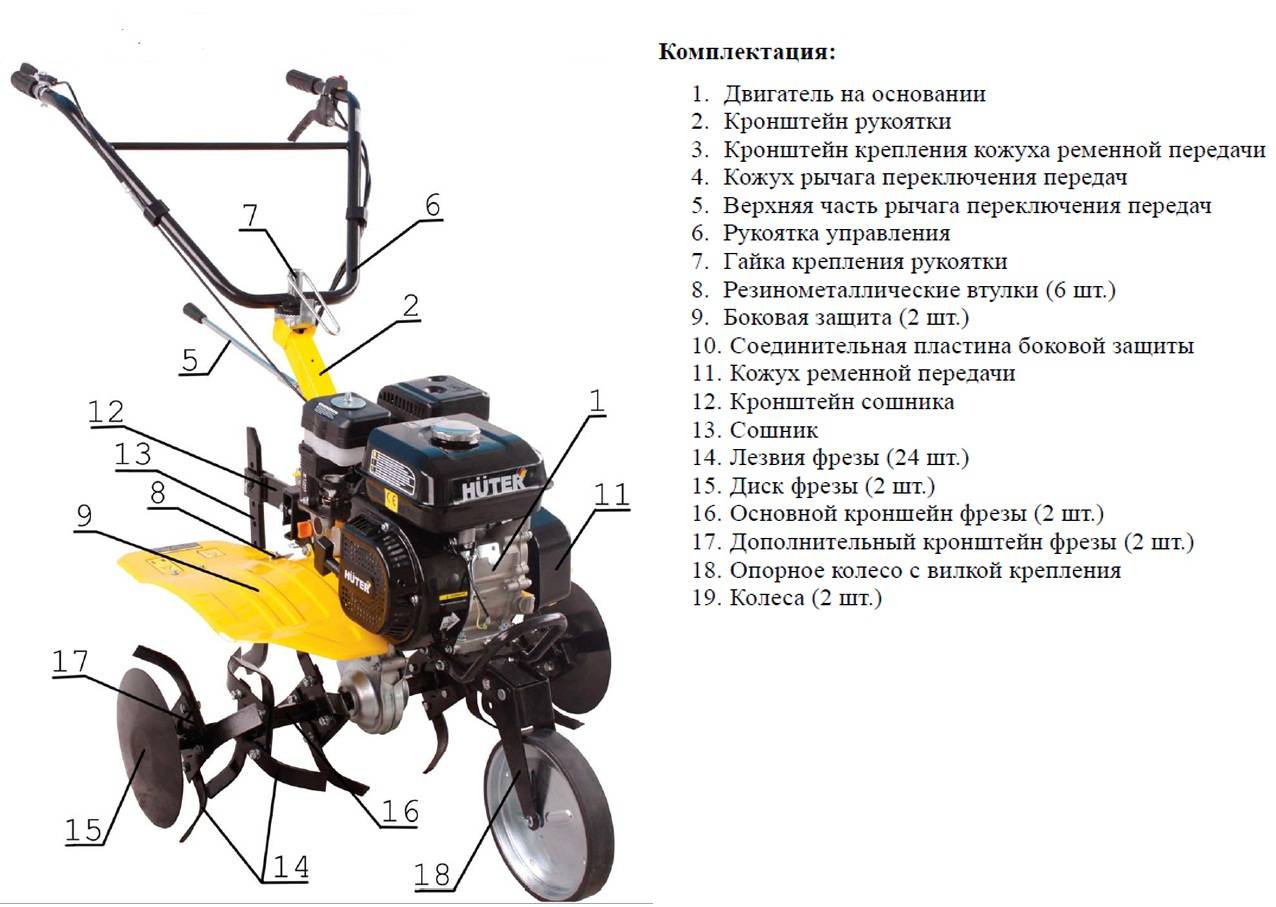Техника имеет 4 передачи: две передние и две задние. Имеется руль, который вращается в разных направлениях. На рынке сельскохозяйственной техники присутствуют два вида мотоблоков. Первый вид – мотоблоки, работающие на бензине. Второй вид — агрегаты на дизеле. У последних имеется ряд преимуществ, которые выражаются в высоком КПД и экономичности потребления топлива.