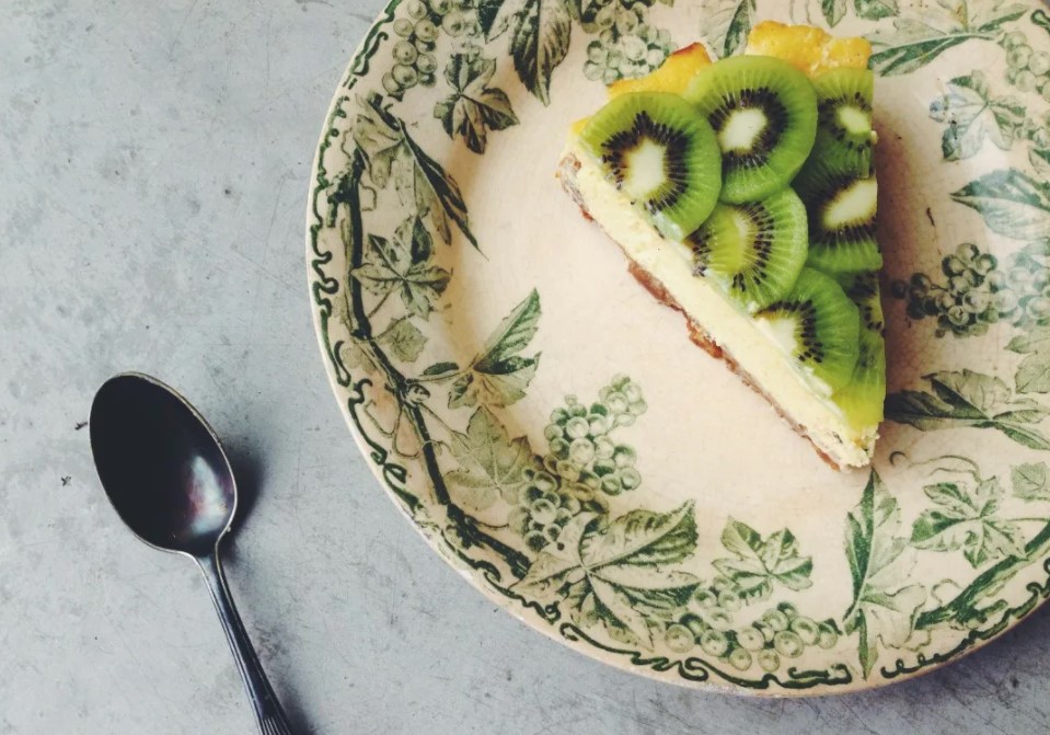 Освежающий чизкейк с выраженным ореховым вкусом и характерной для актинидии кисло-сладким послевкусием содержит 322 калории в 100 г. В его основе отсутствует мука, а нижний слой представляет собой прессованную ореховую крошку.