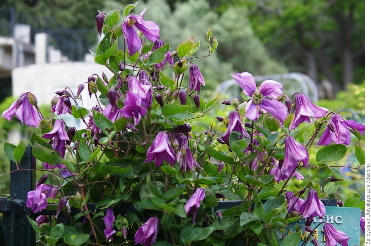 Крупные цветки диаметром до 25 сантиметров приобретают насыщенный фиолетовый оттенок. Кусты, как правило, используют для оформления заборов, стен построек.