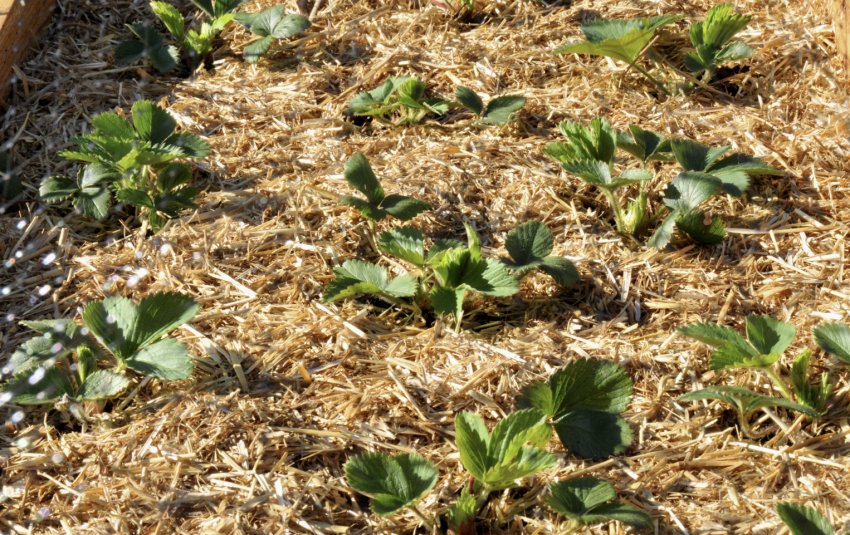 Использование мульчи обеспечивает сохранность влаги и минералов у корней клубники. Также препятствует разрастанию сорняков. Для этого используют: