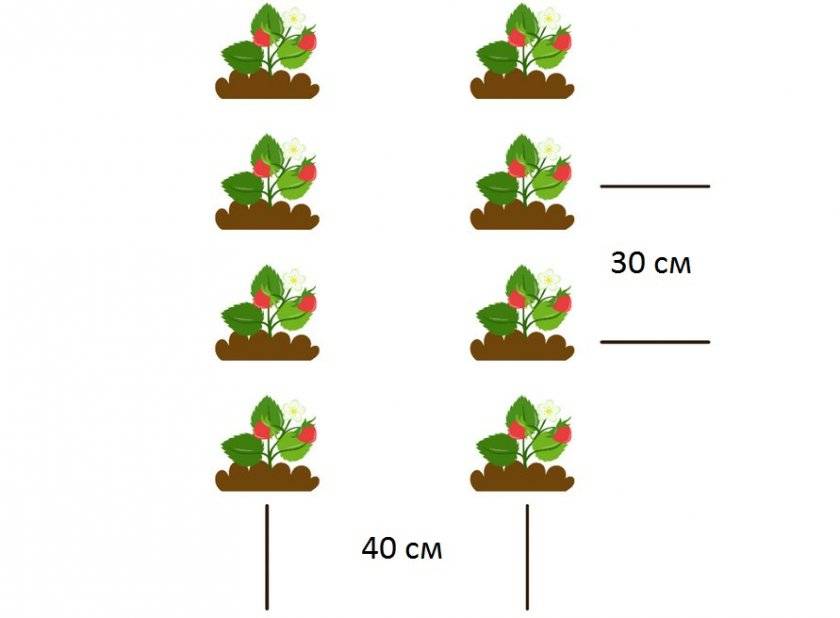 - При укоренении ростков в теплице, используется схема посадки 0,25×0,3 м. В открытый грунт клубника сажается по схеме 0,3×0,4 м.