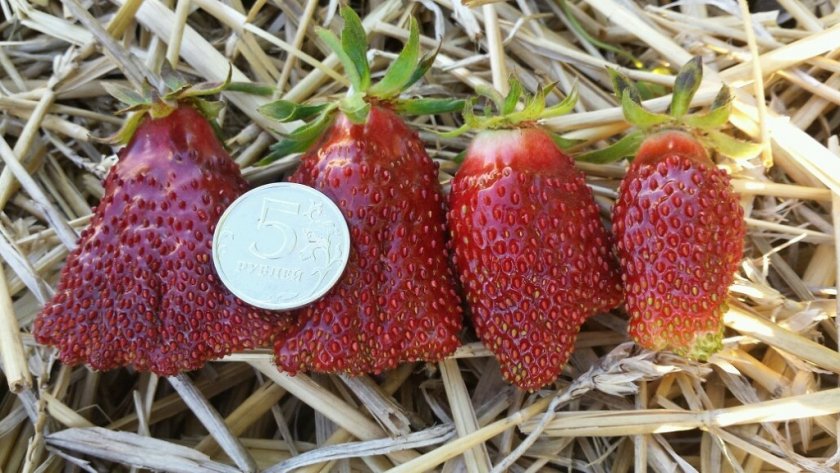 Но встречаются и гиганты до 80 г. Они темно-красные, иногда с фиолетовым оттенком, блестящие, покрыты семенами. Ягодки очень интересные, удлиненные (3-6 см) и могут быть самых разнообразных форм. При взгляде на клубничку можно увидеть форму животного, диковинного цветка или какой-то фигуры. Из-за этого земляника Купчиха очень нравится детям, поедая ее, малыши развивают свое воображение