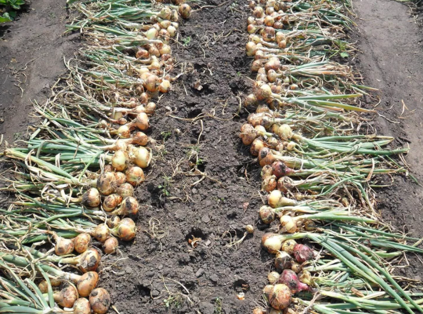 - После выкапывания оставляют луковицы на грядках. Одновременно с сушкой происходит обеззараживание ультрафиолетовыми лучами.