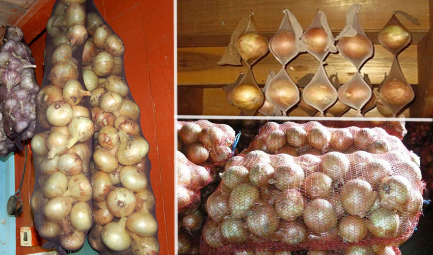 - Сложив урожай в сетки или чулки, подвесить в подвале. Перед этим полностью обрезают шейки и корни.