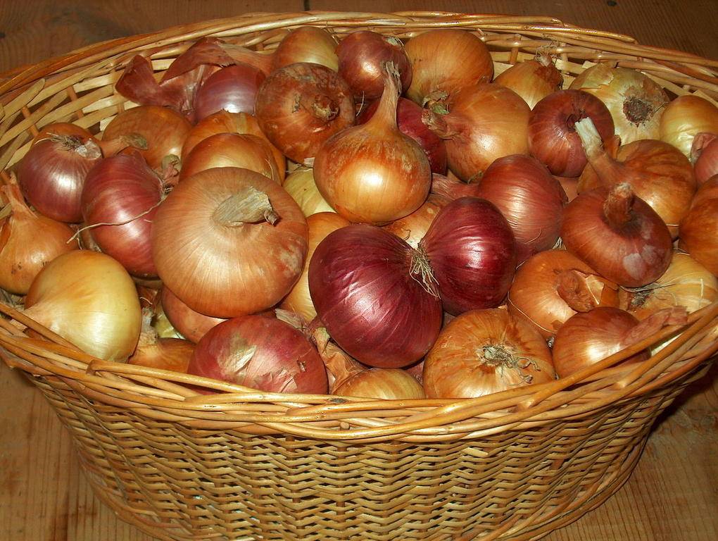 Хранение лука тоже имеет свои тонкости. Тот лук, что сушился на весу «в косах», может так висеть и дальше. Если же вы сушили лук врассыпную, листья пора обрезать окончательно (сухую «шейку» оставляем), и, перебрав его на предмет сырых, испорченных или с вдавленной «шейкой» (эти уже начали гнить) головой, укладываем в емкость, где будет постоянный и беспрепятственный доступ воздуха. Это может быть: