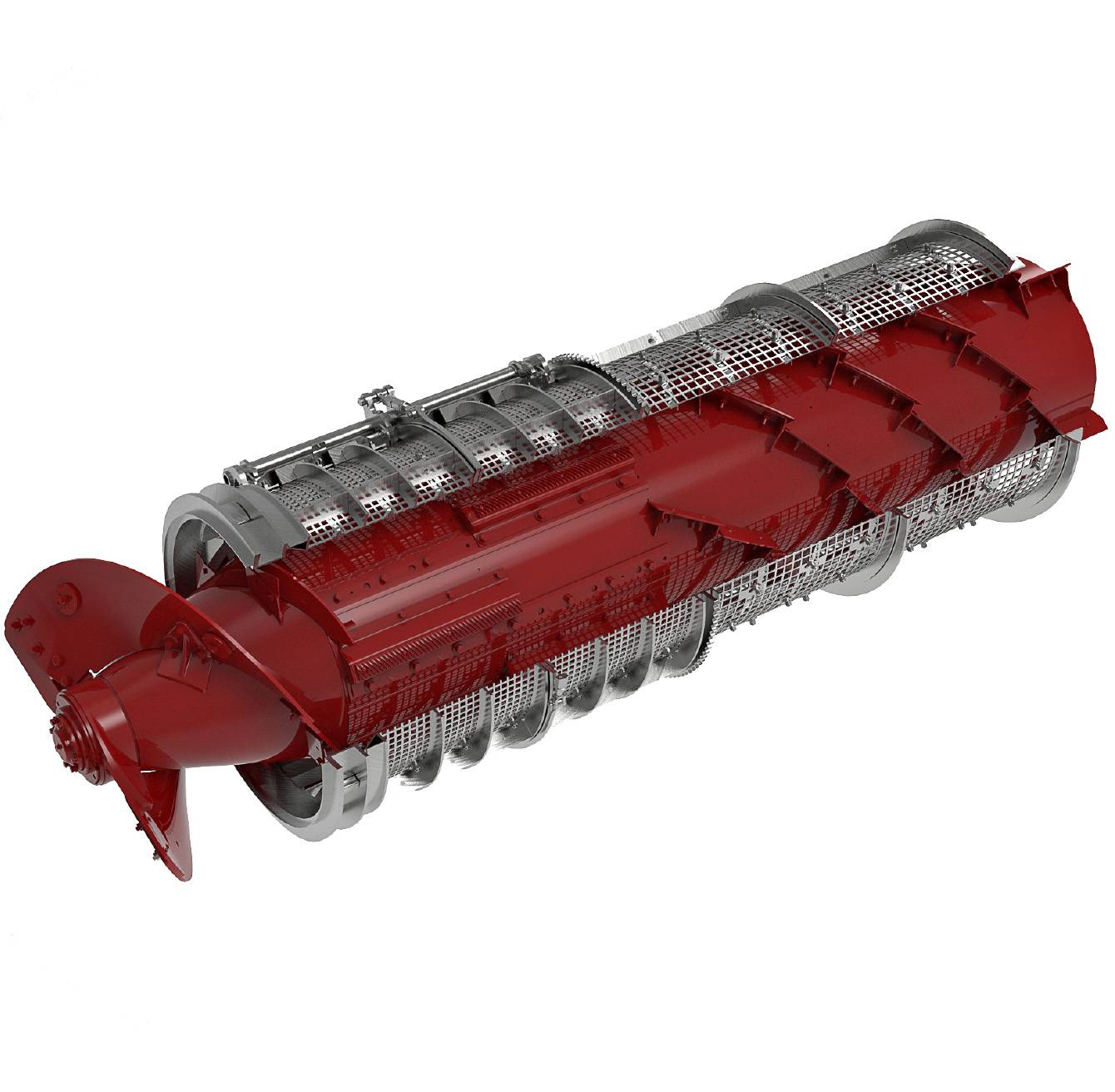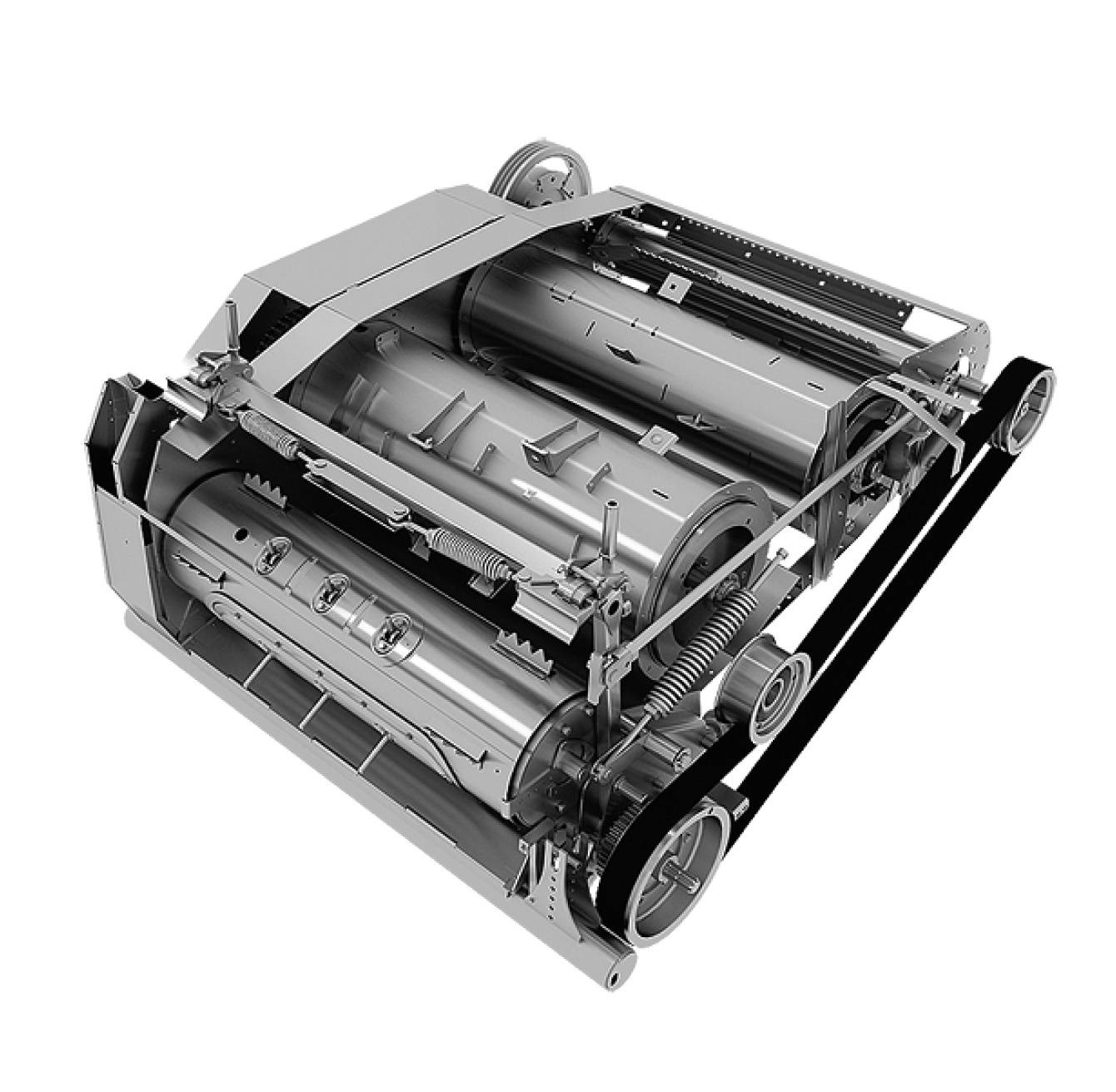 Ротор длиной 3200 мм и диаметром 762 мм дает зону обмолота и сепарации в 360 градусов или целых 5,4 кв. м. При этом дека образует три молотильные секции, которые дают возможность устанавливать зазор в одном сечении. Поэтому ворох обмолачивается не один, а три раза за один оборот ротора. Кроме того, за счет конструкционных особенностей деки возможно установление увеличенных зазоров.