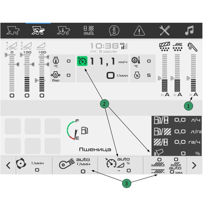 — поддержание постоянной заданной скорости; — поддержание постоянной заданной загрузки наклонной камеры, скорость движения при этом изменяется автоматически для обеспечения стабильности загрузки молотилки при неравномерности агрофона