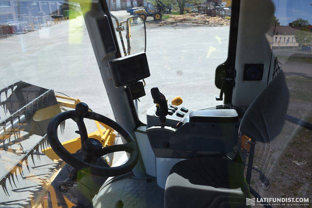 Кабина оборудована кондиционером даже в стандартной комплектации. Водительское кресло достаточно удобное, что позволяет комбайнеру отрабатывать 8-10-часовые смены в комфортных условиях. Контроль за работой проводится с монитора ComVision, а управление узлами и системами — с помощью удобного джойстика и панели кнопок.