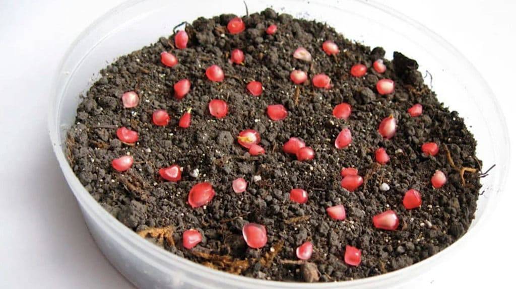 Семена граната заделывают на глубину не более 1 см. Поверхность почвы тщательно поливают, а емкость закрывают крышкой или куском пищевой пленки. Посевы содержат в светлом месте при температуре не ниже +25°C. Емкость периодически проветривают, удаляя с крышки скопившийся конденсат. Первые всходы появляются через 10-15 дней. Иногда для прорастания требуется больше времени.
