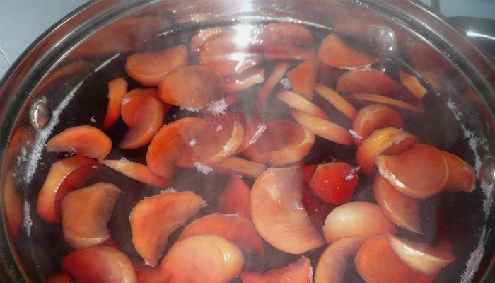 - Плоды персиков и слив отделить от косточек.
