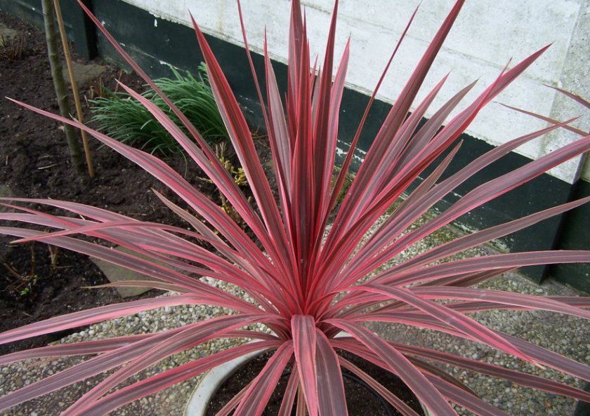 Очень эстетически и экзотически смотрится Кордилина Верхушечная краснолистного вида, которой присущи крупные, широкие листья темно-красной или темно-бордовой окраски. Ближе к центру растение сменяется лилово-коричнево-красным тоном.