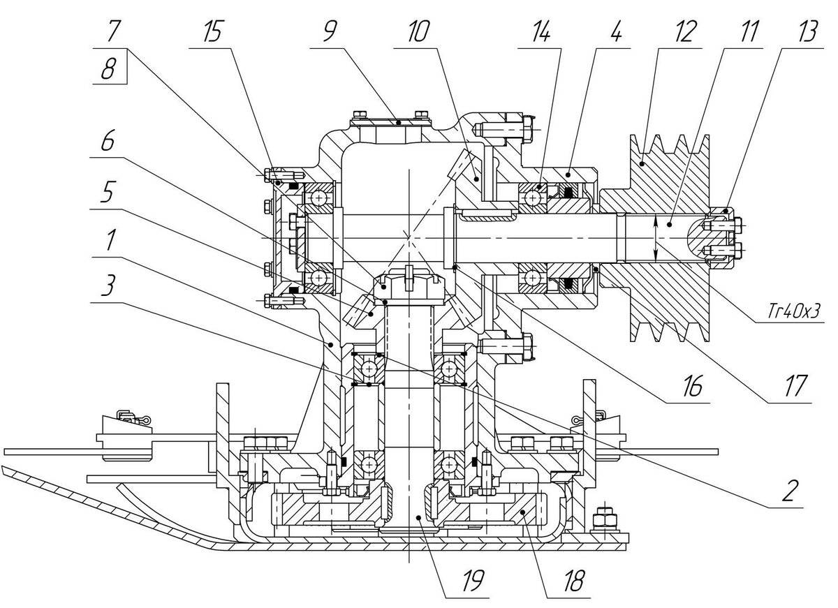 1 – брус; 2 – шестерня; 3 – вал; 4 – колесо; 5 – шестерня; 6 – шестерня; 7 – шестерня; 8 – подшипник; 9 – втулка; 10 – подшипник; 11 – вал; 12 – ротор; 13 – нож; 14 – пробка; 15 – шестерня; 16 – башмак; 17 – колпачок.