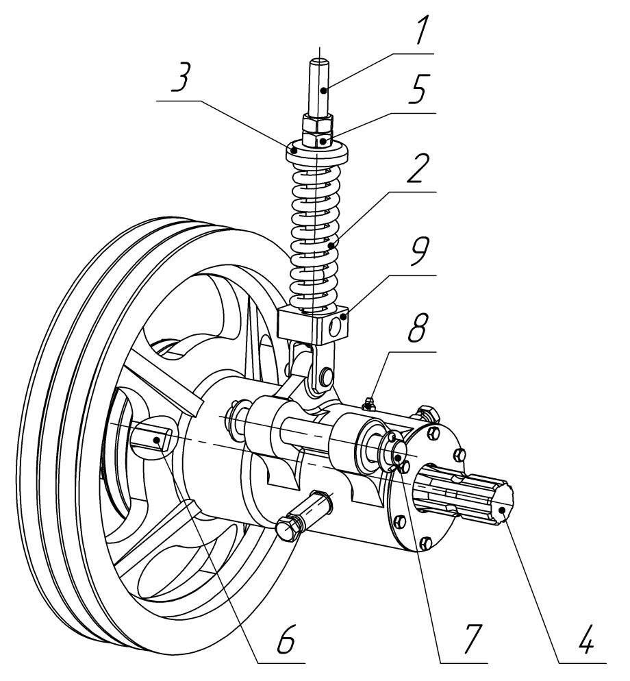 Встретив на своем пути препятствие, косилка разворачивается. Предохранитель, позволяющий сделать это, состоит из пружины с клиновым фиксатором и двух тяг.