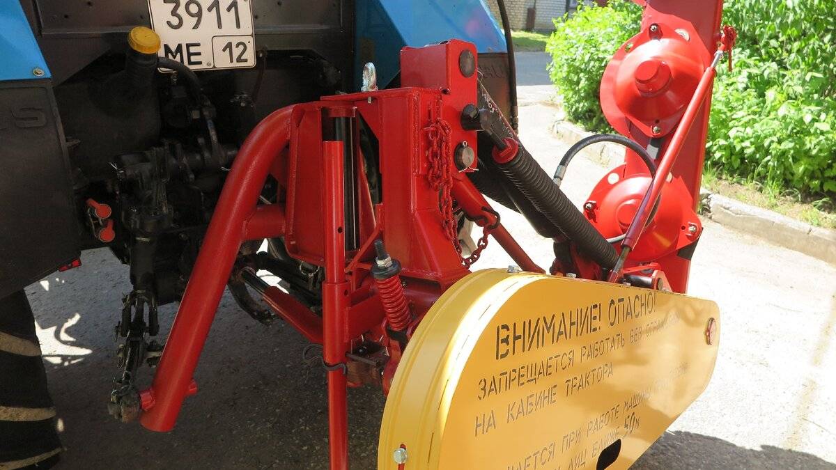 - У них не совершенный механизм откидывания. После столкновения с препятствием срезается штифт. Для продолжения работы необходимо вставить новый штифт. У нас автоматическое защелкивание при движении задним ходом и выходить из трактора не надо.