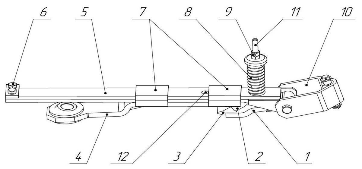 1 – прижим; 2, 3 – фиксатор; 4 – платформа; 5 – направляющая планка; 6 – упор; 7 – хомут; 8 – пружина; 9 – гайки; 10 – скоба; 11 – винт; 12 – отверстие.